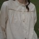 立领古典优雅,胸口是非常高级精细的蕾丝,产量很少,贝壳扣在这件哑光的面料中起到了点亮的作用,下摆有很精美的蕾丝小口袋设计。