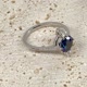 镶嵌了完美切割的莫桑钻石和蓝宝石。主石重1克拉,VVS净度的高品质莫桑钻石具有比钻石更高的光折射效果,比钻石的闪烁度更加高。三颗大小不同钻石的配搭,使手指显得更纤细更优雅。