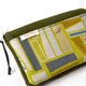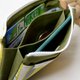 拉链一开即分三个区域: 两侧空间可平放钞票、手机或护照、银行本子等,中间层空间较小可放置零钱和卡片。其中一个区域边上特别设计2格卡片收纳的一字口袋,可放置数张常用的卡片。