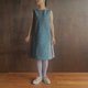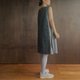 这是一款无袖A字线条、及膝(模特身高157厘米)的拼接洋装。领口前后皆为船型领。后方单颗钮扣可穿脱。内衬为灰色全里。