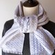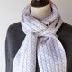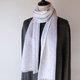 以白色为基底织纹,并以浅灰色与风信子蓝两种颜色织出浮纹图案。图案为大小不一的方形与圆点有节奏地排列,因正面与反面的色调与图案呈现效果不同,您可以透过不同的佩戴方式,体验这款围巾的多样风貌。虽然是细宽设计,但喀什米尔独特的蓬松质感,让围巾即使绕颈两圈或打结佩戴,仍保有足够的长度。流苏的边缘经过固定处理,不易脱线。明亮柔和的色彩搭配,相信能为您在秋冬厚重的穿搭中,增添一抹亮点。