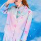 设计师原创印花面料,渐变色彩搭配蜡笔风花朵涂鸦,富有设计感。弹力哔叽面料轻柔舒适,紫色玉石扣点缀,独特不撞款。不规则印花设计每一款都有自己的特色,独一无二。