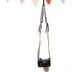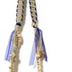 Handmade hemp cord hemp camera strap with navy ribbon and colorful jute edging.