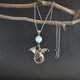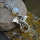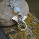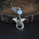 蛋白石(月光玻璃),锌合金镀银,铁合金链条。 吊坠长度约。 70 毫米(2 3/4 英寸)宽约 38 毫米(1 1/2 英寸)。 链条有一个扣环。 如果需要,链条可以更换为钢(医用钢)链条,但需额外付费。