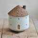 A teacup like a house. It's being made in the small studio in Japan. Everything is handmade. A roof is a lid. A chimney has a hole. Steam may go out from a chimney. For making by hand, there are no same colors and shapes. Please image your story. ーSizeー Teacup:high:About 6.5cm diameter:About 8cm Roof:high:About 4.5cm diameter:About 8cm Total high:About 10.5cm made in Japan / handmade