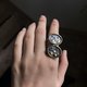 另外,这款戒指改变以往只用一种金属制作的方式,融合了黄铜和纯银:纯银为基底,边框、水怪和日月部分则以黄铜呈现,让戒指的层次更加丰富。