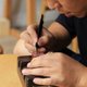 先用毛笔书法手写草稿,再用黑色丙烯颜料手绘到画布上。