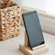 The dark phone stand is made of natural oak wood and coated with linseed oil, while the light phone stand is made of ash wood and has no coating