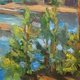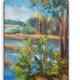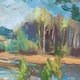 一幅小型春季风景油画,描绘了河流和森林。画作描绘了大自然的苏醒,一条春河倒映着湛蓝的天空。画面明亮而积极。