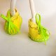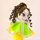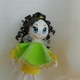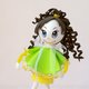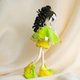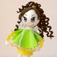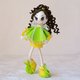 Green dress and yellow shoes of this beautiful doll are decorated with thin lace.