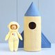 关于太空火箭。这艘太空船填充有中等重量的羊毛,完美地保持其形状。正面有一个窗户,背面有一个拉链,拉链贯穿太空船的整个长度,因此可以轻松地将娃娃放入里面。