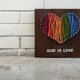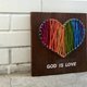 此作品尺寸约:长23厘米宽23厘米长方形, 实木拼接底板,背面有挂钩可供壁挂使用,以铁钉构图,搭配棉质线材,勾勒出设计的图形,以水性颜料手绘质感文字
