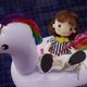 She's wearing stripe tee with yellow floral, pleated wide leg pant, lace stocking with brown shoes, also a pink sling bag!