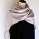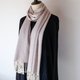 经线采用柔和的象牙白,纬线则搭配沉稳色调的粉米色,编织出细腻而复杂的花纹。由于正面与反面的织纹和色彩表现会有所不同,您可以透过不同的缠绕方式,享受丰富多变的风格。它蓬松柔软且非常保暖,适合在春秋两季作为上衣或外套的替代,冬季则推荐将其在颈部小小缠绕,如同围脖般佩戴。由于混纺了丝绸,因此带有高雅的光泽与华丽感,也可适用于正式场合。