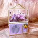 复古但又小巧可爱的留声机外型,压克力透明展示框里,展示了不同色彩鲜艳色彩的永生花,机器可手机连接蓝牙播放音乐,也可插入TF卡、音源线、USB优盘播放音乐。
