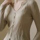 我们希望赋予每件衣物独特的生命力,满足追求个性、注重细节的消费者需求;小 V 领设计,经典又实用,恰到好处的开口深度与宽度,既能修饰颈部线条又能提升穿着者的气质;扭结门襟是整件衣服的灵魂亮点,通过在门襟处巧妙扭结,在设计上有收腰效果,突显女性柔美曲线;独特水波纹理感织法,呈现如水面涟漪自然的灵动纹理,赋予衣物流动韵律感,增加整体服装的视觉趣味性与层次感,使整件衣服更加立体且富有艺术气息。