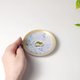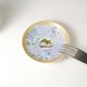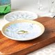 这款盘子以淡雅柔和的色彩描绘花卉以及两只相依偎的绿绣眼,写实的花朵透过薄花色(淡青莲色或淡粉色)的渐层,被温柔地表现出来,让整个器皿仿佛笼罩在一片和煦的春日暖阳之中