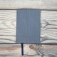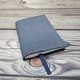 这款书套采用蓝白条纹的丹宁棉布制成,内里缝有一层纯色布料,并附有深蓝色缎带书签。
