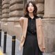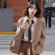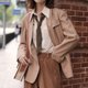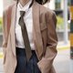 与同色系的杏色衬衫和焦糖色裤子搭配