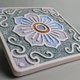品名:手做陶吸水杯垫03 尺寸:约10乘10乘1cm(手工制作,尺寸有些许差异) 材料:熟料陶土和釉药彩绘 技法:浮雕表现和肌理背景 烧成温度:1050度 产地:台湾 基本包装:陶器杯垫作品皆有完整安全的包覆于纸盒里寄出。 表面浮雕制作,经由摄氏1050度高温烧制而成的陶器,具备良好吸水毛细孔,可强力吸收冷热渗出器皿外之水珠,以保持桌面干燥清爽;亦可经由清洗,重新晾干而重复使用,兼具环保功能。