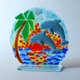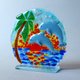 圆形玻璃底座描绘了一个海洋物种、一棵棕榈树和两只跃出水面的海豚。