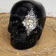 骨架是我用石膏铸造的,涂有压克力黑色涂料,并覆盖有光泽的清漆。一只眼睛的内部黏着莱茵石和珠子。