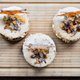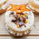 - 先以法国奶油和日本面粉烤制香脆塔皮, 盖上加入大量杏仁粉的天使蛋糕, 加入满满的蔓月莓、自酿莱姆葡萄, 细细打发鲜奶油及用当季水果干做装饰完成点心。