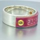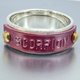 此款银戒指,将绯铜饰板以手工敲上法文的星座图案,再以铆钉固定。