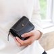 按扣打开式迷你钱包。有2个可折叠的纸币隔层和一个拉链零钱袋。