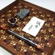 将紫心木/柚木/桧木/枫木..等等裁切三角形状后并加以排列组合制作出渐层感,寄木的纹理与质感宛如台湾老房子的磁砖外墙,显现时间洗练过后的细腻感。边缘与背面为胡桃木,可用于摆设或是咖啡盘、点心盘...等等。