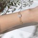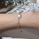 雙鍊設計,細緻的金色線條層層交疊,溫柔卻堅韌,映襯出月光石靈動的美感。搭配銅鍍18K金金屬配件,兼具耐用與奢華。配戴尺寸15cm,附約4cm延長鏈,可依手腕調整,舒適穩固。