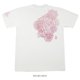 此为以精致线条描绘的小鸟、大象与宝相花图案。宝相花是一种将唐草纹样与华丽图案结合而成的虚构花卉,常见于佛教的装饰艺术中。而白象,则被视为佛陀的坐骑,是象征吉祥的神兽。此设计描绘了大象与小鸟嬉戏、花团锦簇的景象,仿佛置身于极乐净土。左袖上的文字“ただ春の夜の梦のごとし”,出自《平家物语》,意指万事万物皆如春宵短梦般,短暂易逝。