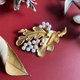 80年代美国古董饰品,典雅可爱的植物造型,貌似羽毛的旋转螺纹波浪感,中和了金面的沈甸甸。镀金的工艺及成色极佳、手感微重,是一组状态好收藏价值极高的古董饰品。