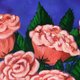 一束充满活力的粉红玫瑰在明亮的蓝色花瓶中与浓郁的紫色背景完美地结合在一起。玫瑰用细致的笔触描绘,增加了花瓣和叶子的深度和纹理。