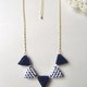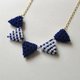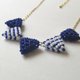 The navy blue one-color triangular motif of the "Flag Garland Necklace" is specially knitted with black fishing line.