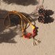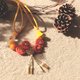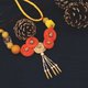 项链以绳结与织物手法连起,运用不同元素珠子密腊?等,配以黄色绳子组合已成。