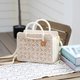 * 仿藤编织+菱格绣花 21cm x 16cm x 9cm * 配色聚脂纤维布内里连顶口拉链开关 * 仿藤编织手挽, 中高6cm * 编织腊绳肩带, 中高51cm * 颜色:红色 / 黄色 / 绿色 / 米色