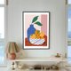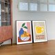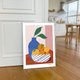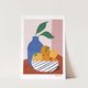这是一幅静物画,以大花瓶中的橙子和树叶为特色,使用柔和的色彩。这款艺术印刷品带有复古气息,将为您的空间增添酷感。