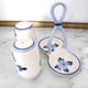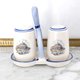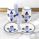 美丽又实用的调味料瓶套装,陶瓷制造,一面是法国着名的景点圣米歇尔山 (Le Mont-Saint-Michel),另一面是深蓝色手绘花朵图案。配有一个手工制的支架,上面有同样的花朵图案,手柄造得非常原始,微微倾斜的。如何决定调味料瓶要放甚么呢?法国人通常用有三个孔的放盐,因为用得比较多,而有两个孔的则放黑胡椒。