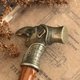 这是结合实用性与艺术性的古典拐杖,以珍稀的栗木制成。其木瘤凸起鲜明、纹理如大自然的雕刻,栗木相对轻盈但坚韧,这也是它常被用于拐杖的原因之一。拐杖的把手由青铜打造,雕刻成戴高帽、鼻子突出的人头像、厚重的头端有自卫的功能设计,雕刻细致,设计独特且充满文化意涵。这支拐杖既是收藏家的梦幻逸品,也是自卫和外出时的最佳伴侣。