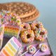 Miniature-a set of desserts rainbow cake, donuts with colored sprinkles and lollipops.