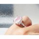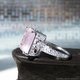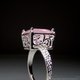 这款戒指精选了来自巴西的玫瑰石英,其柔和的粉红色调在方形切割下更显迷人,并镶嵌于带有唐草与缕空图腾的座台上。