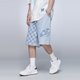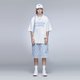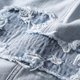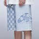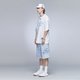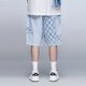 棋盘格拼接牛仔短裤,采用牛仔的面料和纯色的牛仔拼接,直观简练,牛仔贴布绣露出毛边,打破平衡,富有创意,增添层次。
