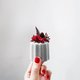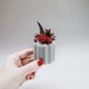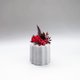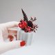 花材:红色小米花、鲜红开心果、酒红蕨叶、八角小米果、松果