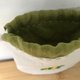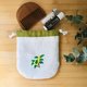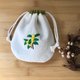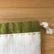 以白色提花棉布缝制的小巧束口袋,布面带有柔和的纹理。袋口搭配温润的绿色亚麻布边与手缝点缀,呈现安静温暖的手作质地。
