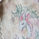 This delicate coin purse is made of cotton & linen fabrics. The unicorn is cross stitched with original DMC floss on 46 ct fabric, which means really tiny stitches and very fine work. I used a magnifier and beading needle to embroider this picture.