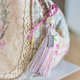 The bag is decorated with metal "handmade" tag on the back side and handmade tassel.