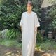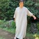 采用了麻织品原色的米白色布料,制成这款宽松的削肩洋装。