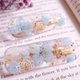 蓝花绣球发夹 尺寸:7cm 材质:韩国保色发夹 水滴形的底有加极光碎片,转动时会有不同的光线变化喔! 长方形的则是透明底色,搭配小碎花们,很适合夹在公主头上装饰