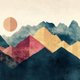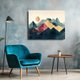 以几何色块勾勒出壮丽的山脉剪影,深邃的蓝绿色调搭配明亮的红色与温暖的黄色,呈现出独特的视觉层次。复古纹理与现代构图的完美结合,营造出充满想像力的奇幻山景。专业微喷技术完美重现细腻质地,为现代简约风格居家空间增添一抹艺术感。